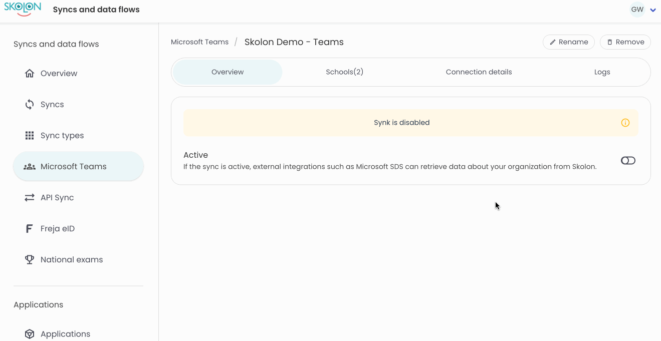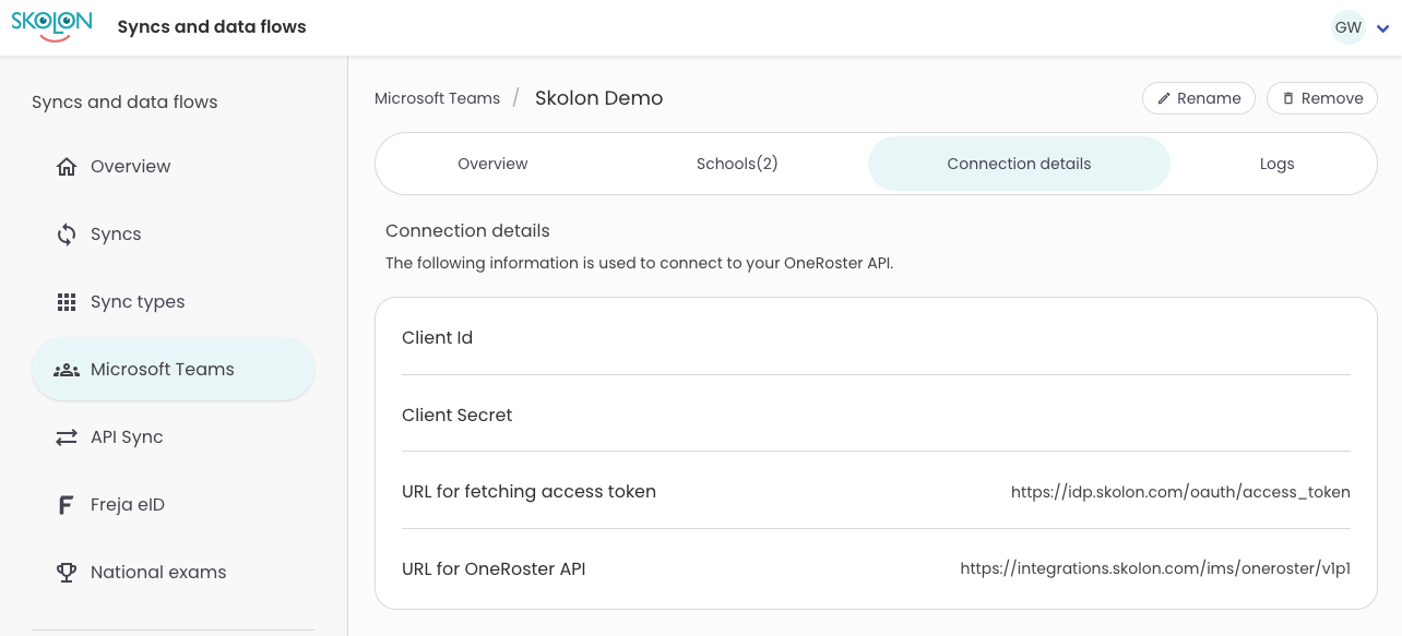 You will find the connection credentials for Skolons OneRoster API in the Skolon Data Hub under “Microsoft Teams”