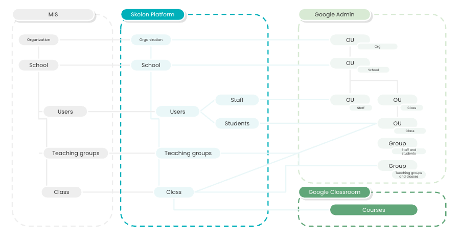 Skolon's Lifecycle Management integration with Google Workspace provides a powerful and automated way to manage users, groups, organizational units (OUs), and Google Classroom courses—directly from the school’s source systems, such as their MIS (Management Information System). This means that educational institutions no longer need to manually create or update user accounts, groups, or class structures within Google Workspace. Instead, Skolon syncs everything automatically based on the school’s existing data.